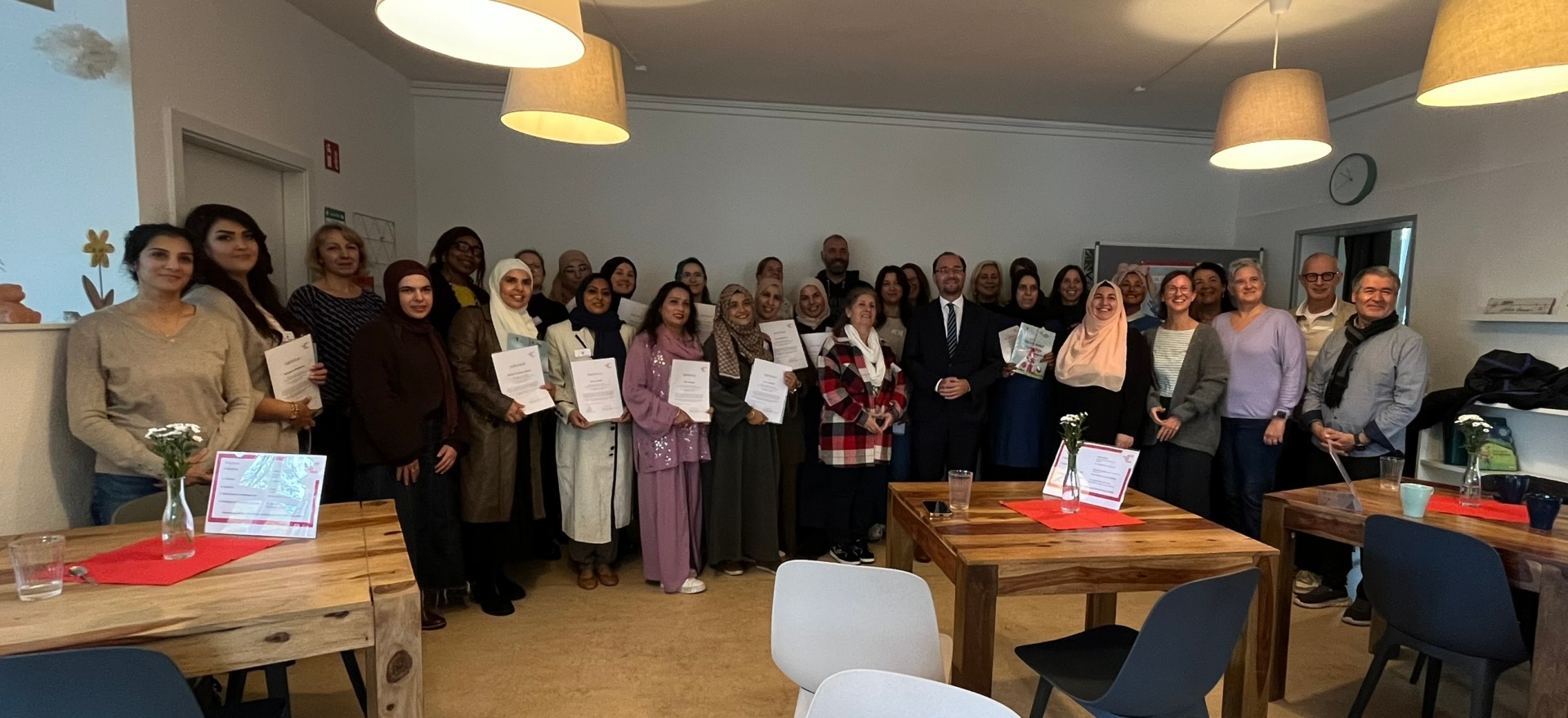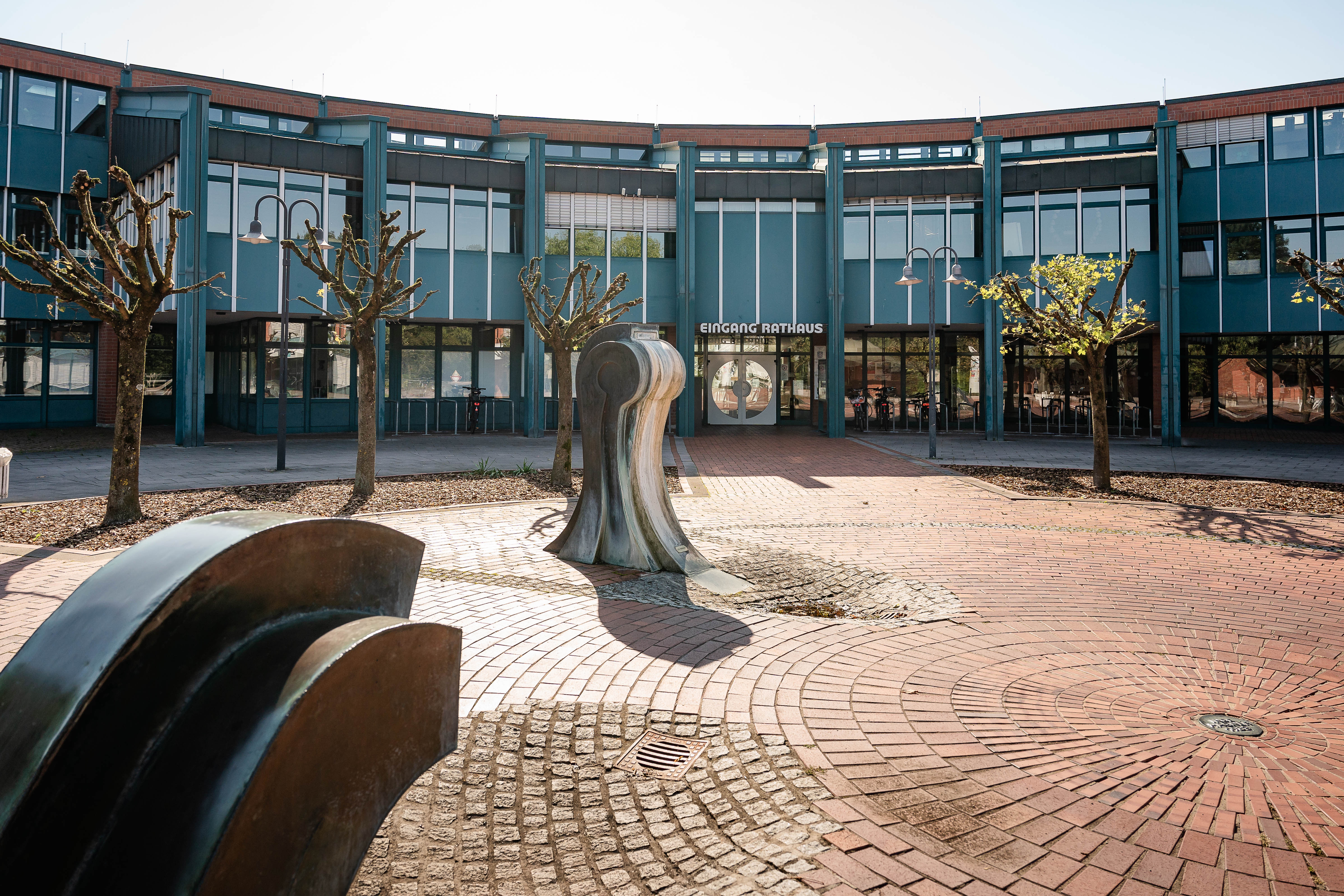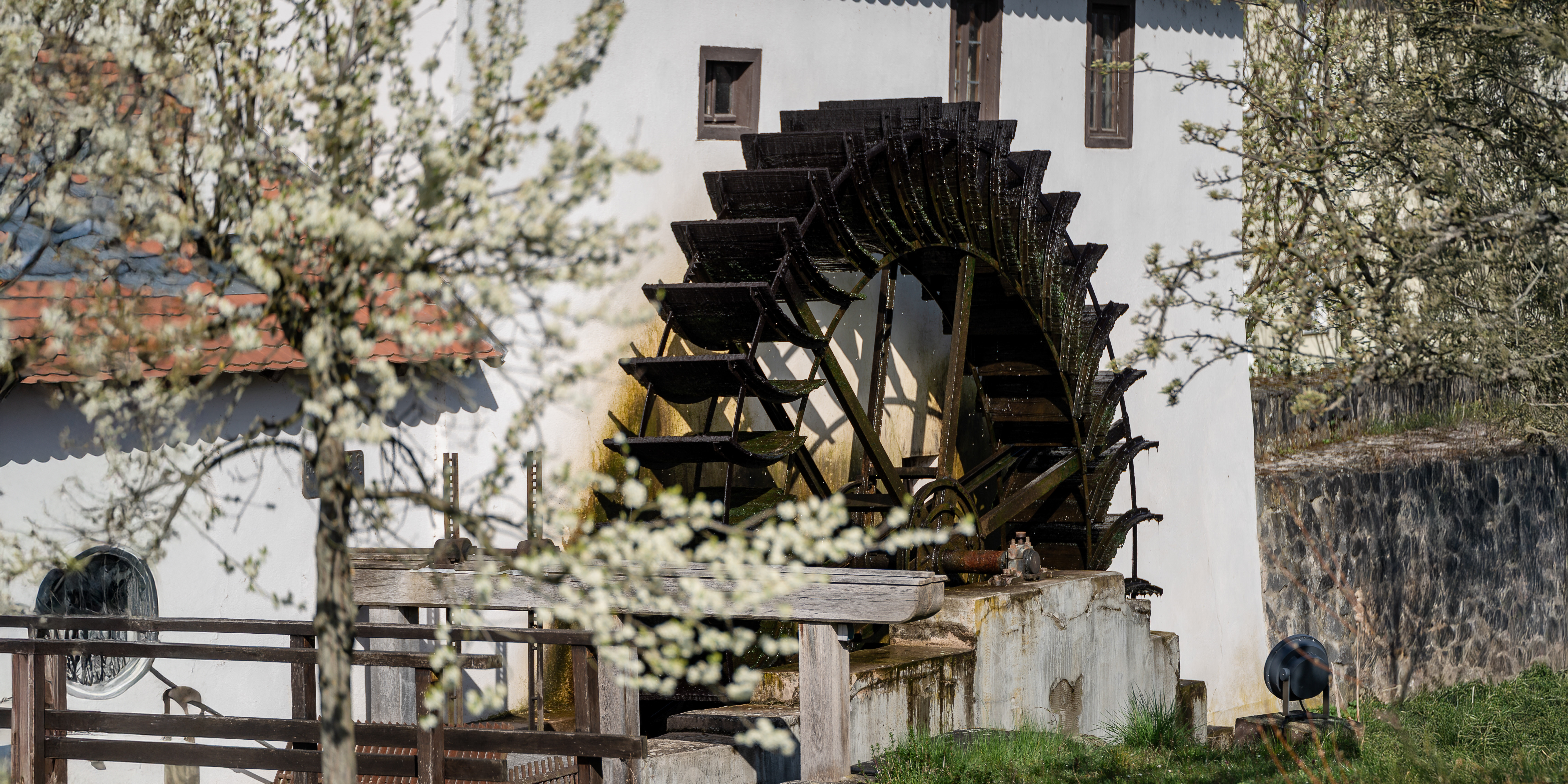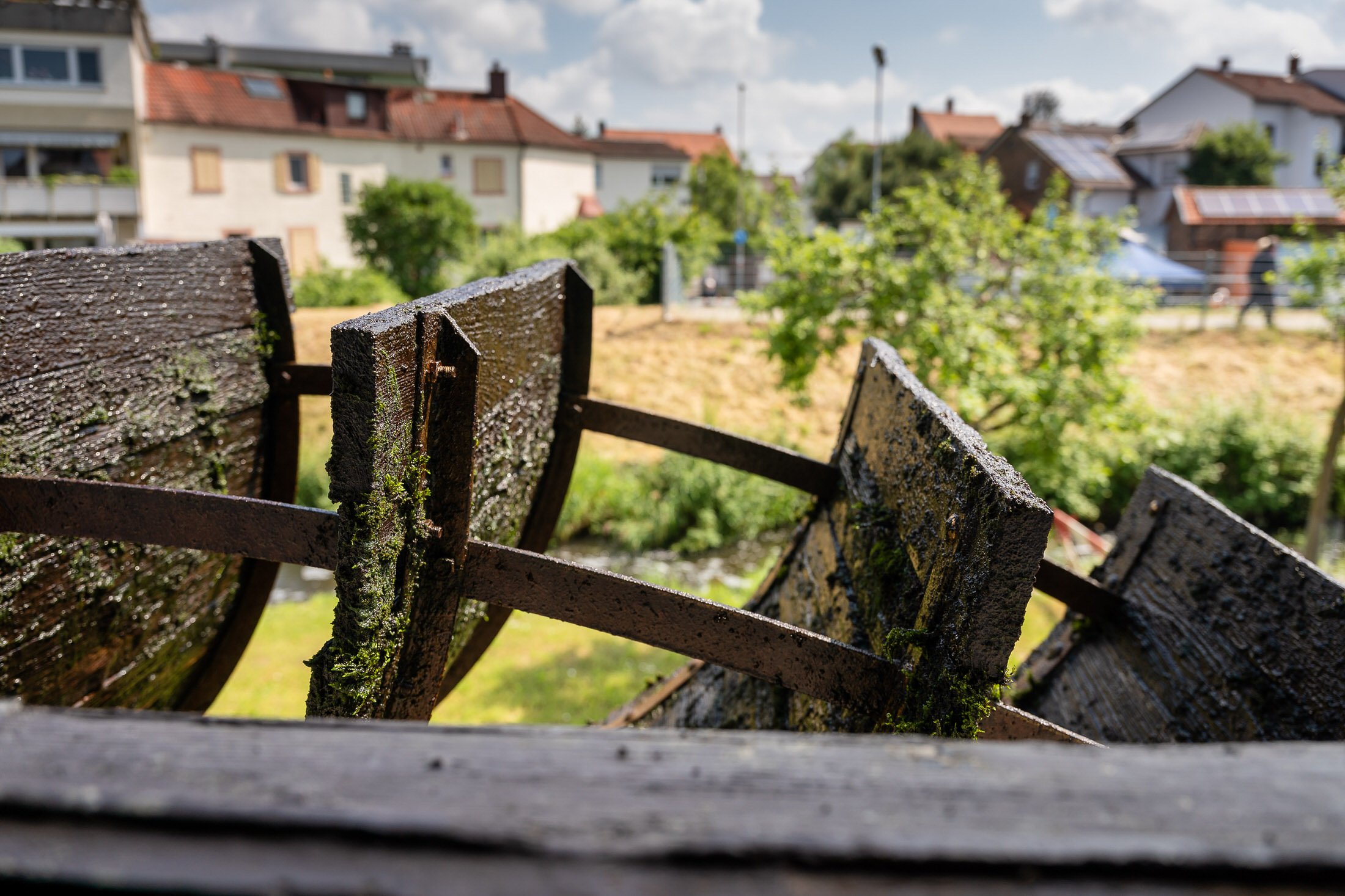 Das Mühlrad nimmt Bezug auf die Geschichte der Stadt mit bis zu zehn Mühlen und ist ein redendes Symbol. Die drei Blüten sollen die ersten Gehöfte symbolisieren und der blaue Hintergrund an die Lage am Wasser erinnern.
