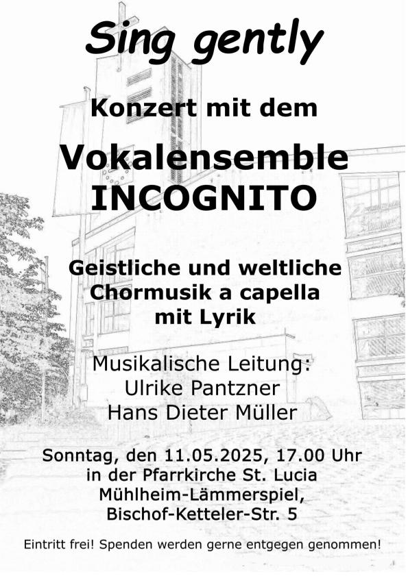Das Vokalensemble INCOGNITO präsentiert ein umfangreiches Programm geistlicher und weltlicher Chormusik a capella mit Lyrik. Musikalische Leitung: Ulrike Pantzner und Hans Dieter Müller.