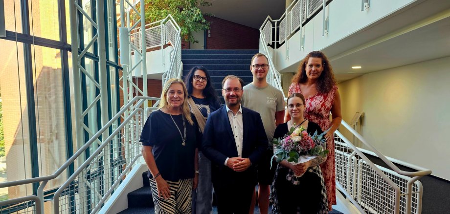 Bürgermeister Dr. Alexander Krey (unten Mitte) und Fachbereichsleiterin Eva Scholz (unten links) bedanken sich bei Daniela Meckmann-Tribian (oben rechts) und ihrem Team der wilden Zwerge. Die wilden Zwerge haben seit der Gründung im Jahr 2023 die Mittagsverpflegung der Dietesheimer Kids übernommen und damit die Stadt in ihren Bestrebungen, die Kindertagesbetreuung in Mühlheim flächendeckend auszubauen, unterstützt.