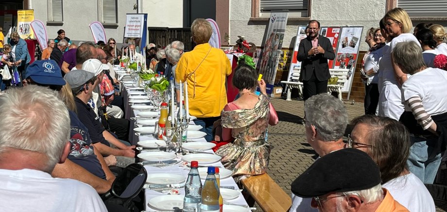 Selbstverständlich ließ es sich Bürgermeister Dr. Alexander Krey nicht nehmen, alle Ehrenamtlichen an den Ständen persönlich zu begrüßen und zum krönenden Abschluss die „Lange Tafel“ zu eröffnen: Eine festlich gedeckte Tafel über 8 Bierzeltgarnituren, an der die beteiligten Ehrenamtlichen Platz nehmen und sich bei allerlei Leckereien austauschen konnten. Funkelnde Kerzenständer, weiße Tischdecken und Blumengestecke bei strahlendem Sonnenschein verfehlten ihre Wirkung nicht und unterstrichen, welchen Stellenwert und welche Wertschätzung das ehrenamtliche Engagement in Mühlheim genießt.