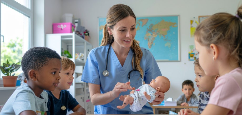Janina Müller begegnete den Kindern mit großer Offenheit, berichtete über ihre Tätigkeit und beantwortete Fragen rund um die Zeugung, Schwangerschaft, Entbindung und Betreuungszeit nach der Geburt. Durch das Erfahren einer positiven Geburtskultur und den offenen Umgang der Kinder mit diesen Themen kann ein wichtiger Schritt für die Gesundheitsprävention gelegt werden.