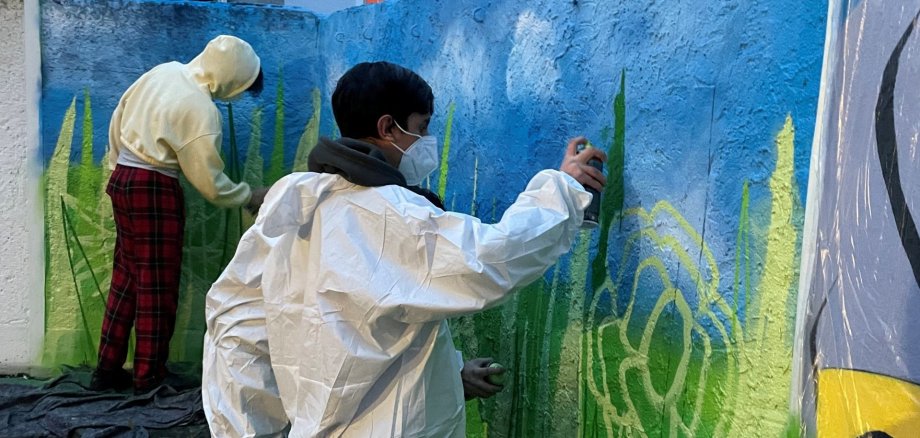 Sommer aus der Dose: Die Jugendlichen besprühen bei winterlichen Temperaturen einen Wagen mit Wiesenmotiv