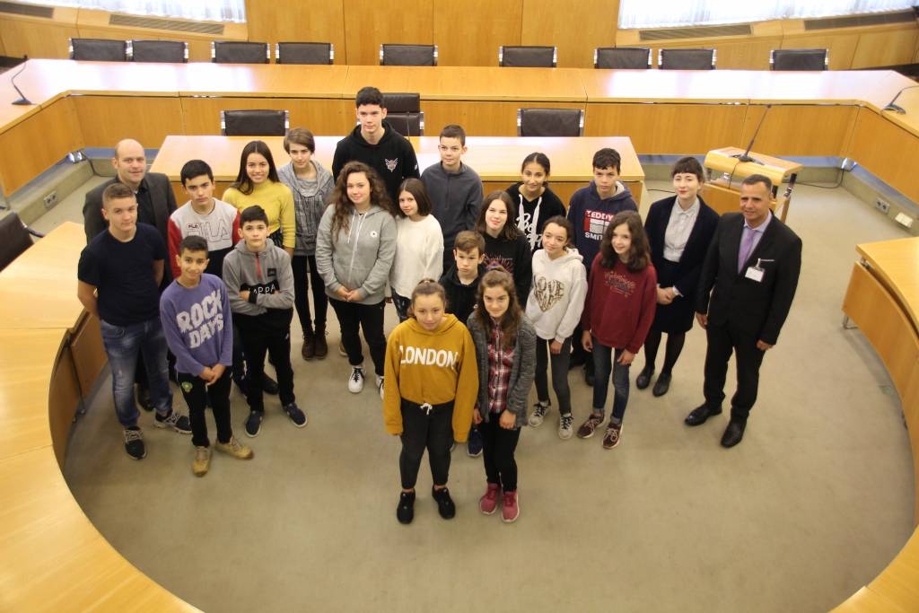 Heute Vormittag begrüßte Bürgermeister Daniel Tybussek im Stadtverordnetensitzungssaal 20 Schülerinnen und Schüler sowie Schuldirektor Moncef M`Haouech in Begleitung zweier Lehrkräfte, die aus unserer Partnerstadt Saint-Priest zum Schüleraustausch unsere Mühlenstadt besuchen.
